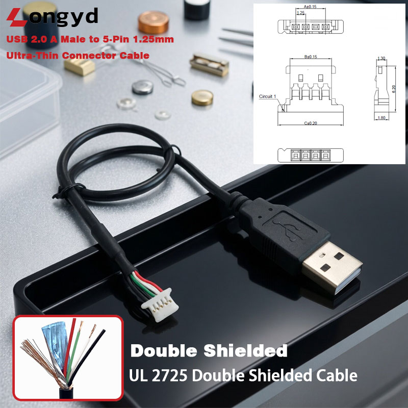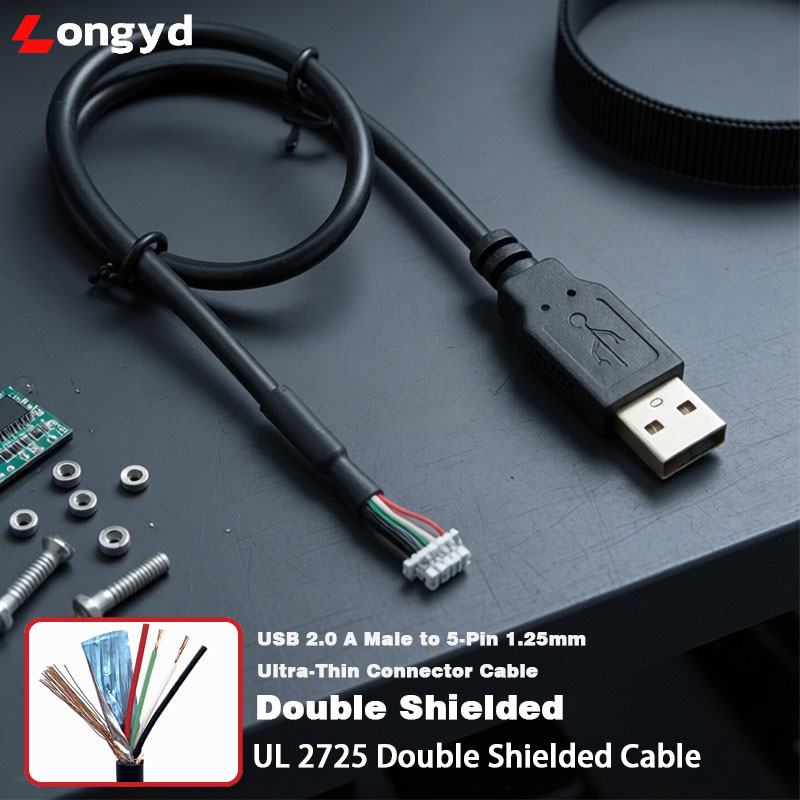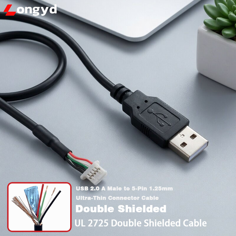 UL2725 Double Shielded USB 2.0 A to 5-Pin 1.25mm Pitch Cable, 5-Wire High-Speed Data Harness